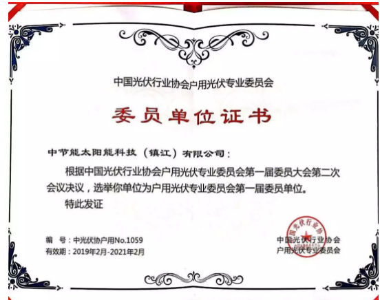 公司荣获——中国光伏行业协会户用光伏专业委员会委员单位证书