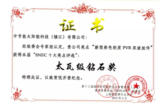 公司荣获——“SNEC十大亮点评选”太瓦级钻石奖
