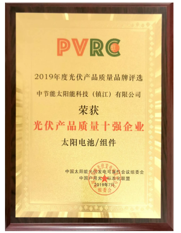 公司荣获——“2019年度光伏产品质量品牌评选”光伏产品质量十强企业