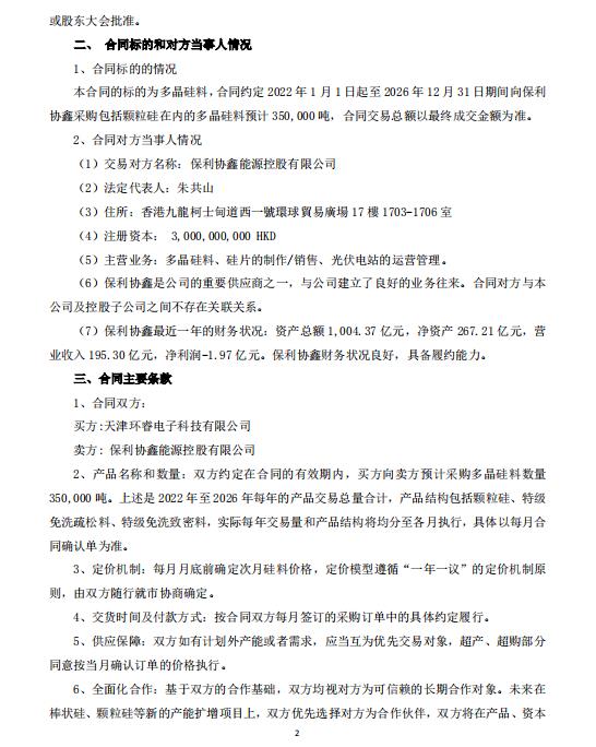 据报道,中环股份2月2日晚间公告称,子公司天津环睿与保利协鑫签订《多晶硅购销合作长单框架协议》,公司在2022年1月至2026年12月期间向保利协鑫采购包括颗粒硅在内的多晶硅料合计共350,000 吨,合同交易总额以最终成交金额为准。