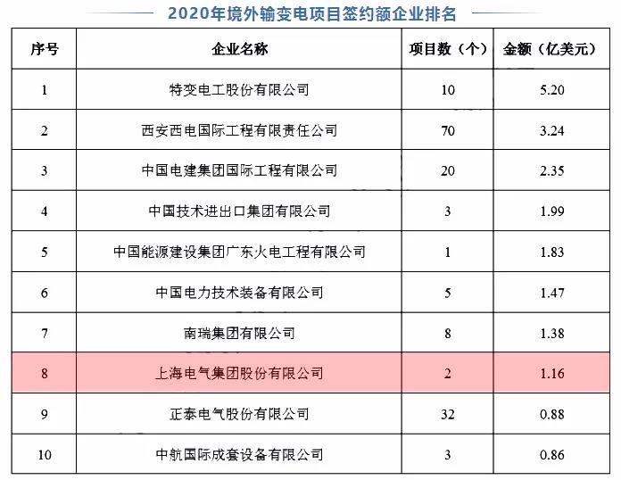此外,在“2020年境外输变电项目签约额企业”排名分榜中,上海电气以1.16亿美元的金额位列第8。