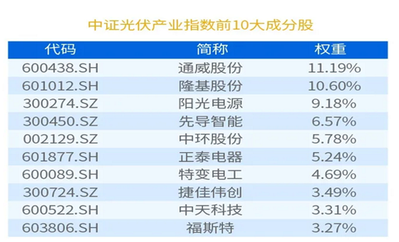 截至2021年1月,中证光伏产业指数成分股共50只,前十大重仓股权重占指数总权重约63%。