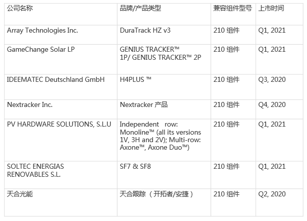 本次发布适配210组件的跟踪支架品牌、适配产品及上市时间如下(按英文首字母排序):