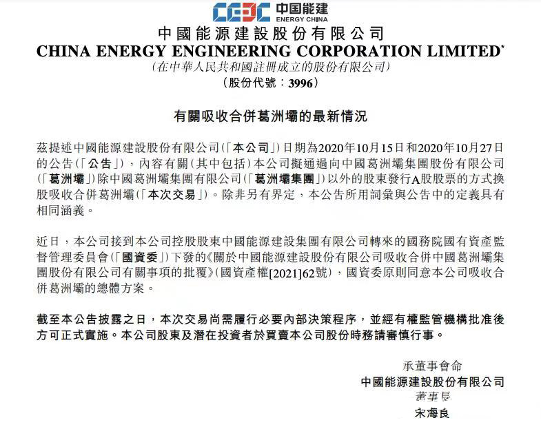 2020年10月28日,葛洲坝发布公告称,中国能源建设(03996.HK)拟通过向葛洲坝股东发行A股股票的方式对其换股吸收。交易完成后,中国能源建设将实现A+H股上市,葛洲坝则终止上市,全部资产、负债、业务等由前者承接。