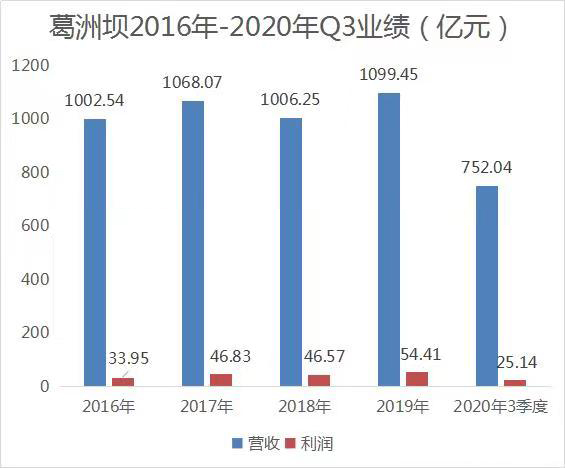 2020年3季度报显示,葛洲坝营业收入752.04亿元,同比增长3.05%,净利润25.14亿元,同比下降21.39%。