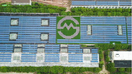 位于上海浦东的地铁龙阳路基地为地铁2号线和7号线服务,每天都有列车进进出出。但许多人不知道的是,这里的地铁车库还是一座隐藏的“发电厂”。登上车库屋顶,看到屋顶几乎铺满了太阳能板。其中大大的M字样光伏板嵌套着绿色草坪分外显眼,Metro代表着地铁,绿色象征着环保。地铁车库屋顶能发电!源源不断为地铁列车提供绿色清洁电能。