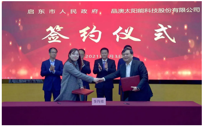 3月3日,晶澳科技与江苏省启东市人民政府签订战略投资框架协议,晶澳科技将在启东市投资建设20GW光伏电池、组件及配套光伏装备项目。启东市委副书记、市长杨中坚,晶澳科技董事、执行总裁牛新伟博士等领导出席签约仪式。