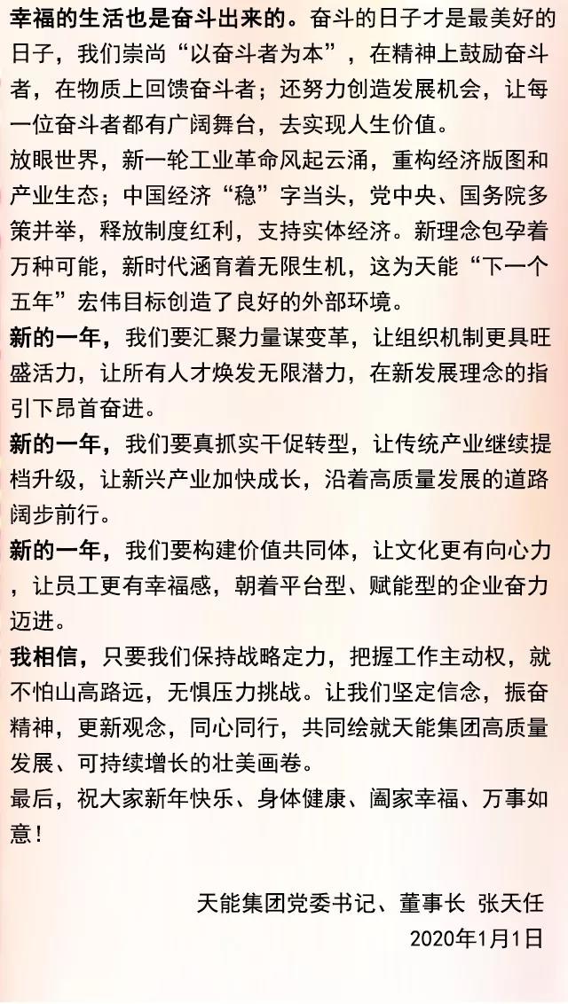 伴随着新年的第一缕曙光,我们告别了令人难忘的2019年,迎来了充满希望的2020年。值此辞旧迎新之际,天能集团党委书记、董事长张天任通过天能集团新媒体平台,发表新年贺词。