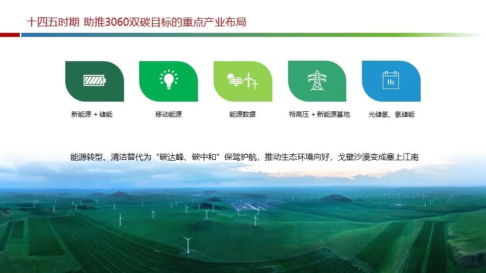 “十四五”时期,能源电力将从高碳向低碳、从以化石能源为主向以清洁能源为主转变,风光储氢等新能源迎来高速发展,能源供给清洁化,终端能源消费电气化,清洁能源利用高效化,移动能源、电动汽车、分布式能源、储能与多种形式的新能源、清洁能源发电一起,共同推动碳达峰。