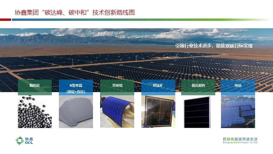 零碳时代的协鑫集团,技术创新路线图主要是,聚焦颗粒硅,做强做精做优FBR技术,同时围绕高效N型单晶(铸锭与直拉单晶)、异质结、钙钛矿、叠瓦组件,以及N型接触钝化电池技术等重点科技领域,以有主有次,自主与参与结合的方式,形成复合式的技术组合方案与实施路线。一直往下,延伸到电站应用、风光储氢、风光储+特高压的模式应用端,构筑零碳时代的核心竞争力,为推动碳中和而努力。
