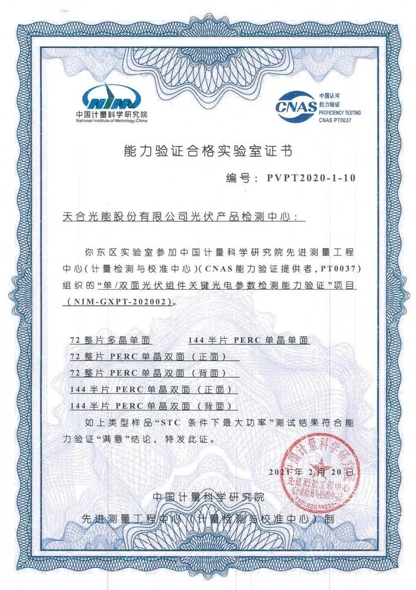 2020年11月天合光能参加了由中国计量科学研究院举办的“单/双面光伏组件关键光电参数检测能力验证”。近日,常州基地东区和西区两个实验室参加的共六个项目测试均获得“满意”结论,并获得“能力验证合格实验室证书”。