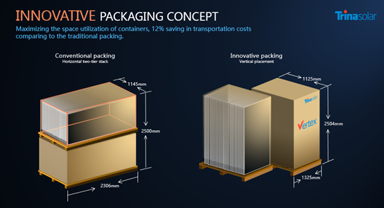 针对600W+系列产品,天合光能创新地推出了竖向包装方式,不再因组件宽度,而受集装箱高度的制约。这种包装方式对集装箱内部体积的利用率做到了极致。相比传统方式,增加了12%的装载功率,节约物流费用12%。