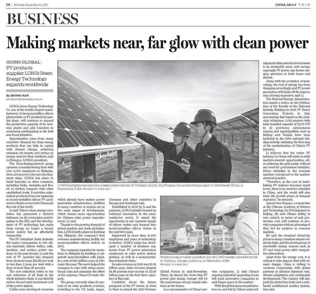 2019年,隆基股份的快速发展受到多家国家级媒体大型专题报道关注,新华社《中国经济的韧性》、中国日报《Going Global》专题分别对隆基进行了长篇深度报道。