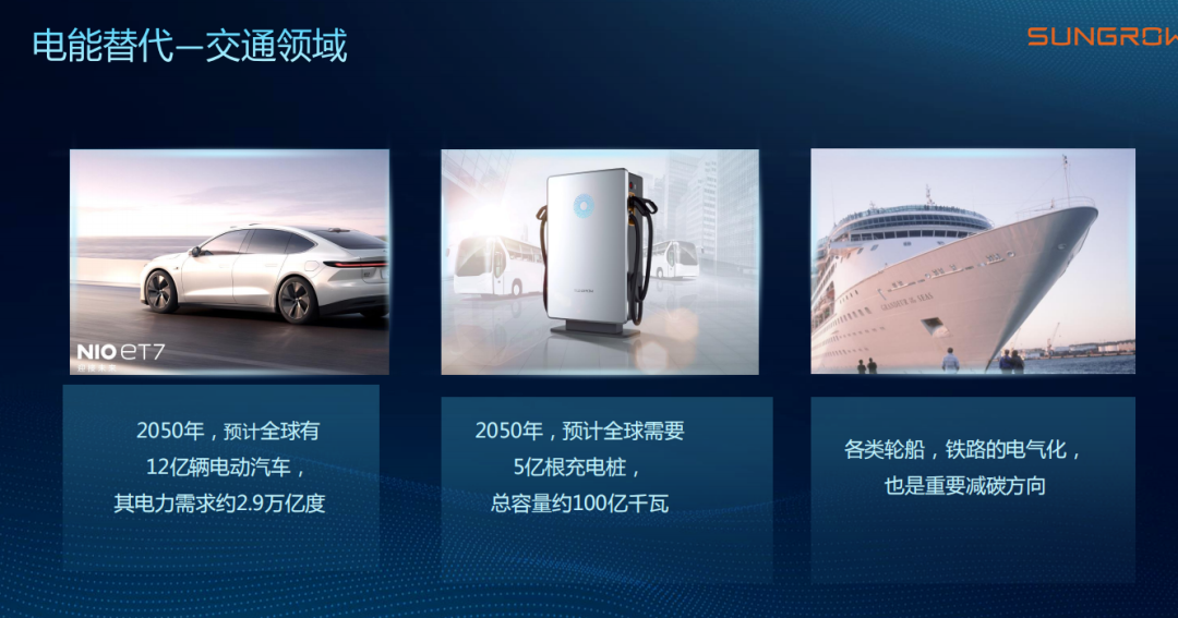 在交通领域,电能替代方向明确,有非常多的应用。如电动车,2050年会有12亿辆,需要5亿根充电桩,总容量约100亿千瓦。