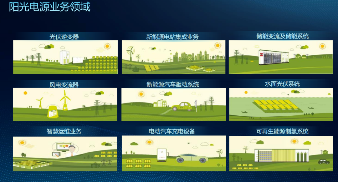 首先来看阳光电源的业务领域:一方面是我们的风光储板块,大家所熟知;同时还有全球领先的水面光伏系统,以及最近蓬勃发展的电驱、智慧运维、充电、制氢等等。
