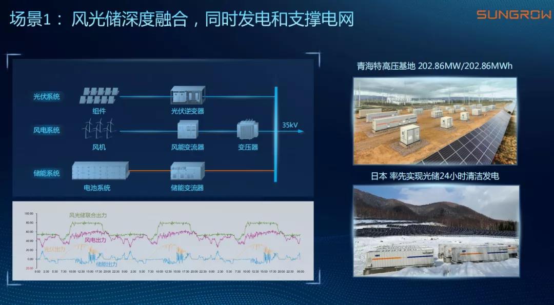 解决方案的场景一,是在大型能源基地里风储与光储的全面融合,这是今年普遍应用的流行形势。这些风储、光储加上我们的能量管理,阳光电源可提供一站式的解决方案。