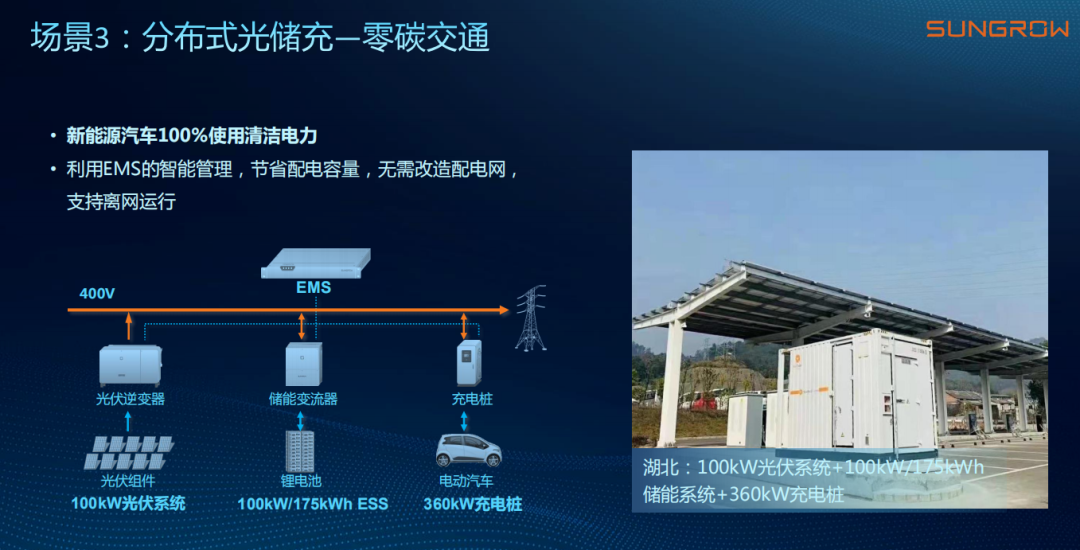 第三种场景是分布式的光储充。利用EMS的智能管理,节省了配电容量,无需改造配电网,支持离网运行,从而实现真正的“零碳交通”。