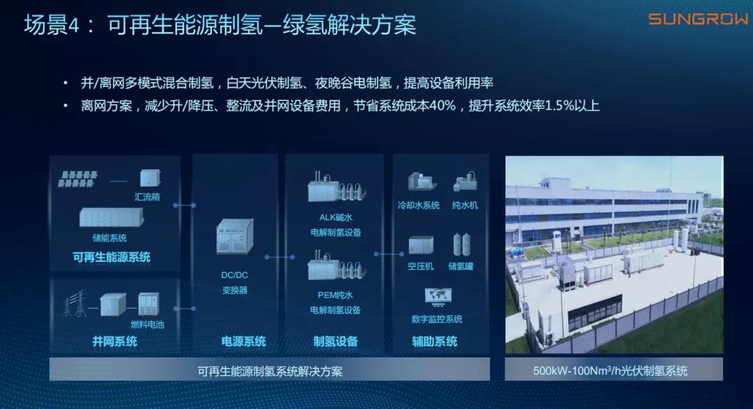 第四个场景是可再生能源制氢,就是所谓的绿氢解决方案。图中我们可看到,右边是我们的工业园,做了500千瓦的示范项目。在这些系统里面,可以实现制氢系统的混合模式运行:白天可用光伏制氢,夜晚可以用谷电制氢,在电网比较差的地区可以实现完全的离网制氢,从而可以减少对电网的依赖。离网可以把光伏直接转换为制氢装备来使用,减少了我们很多的整流设备和并网设备费用,从而提升系统效率1.5%以上。