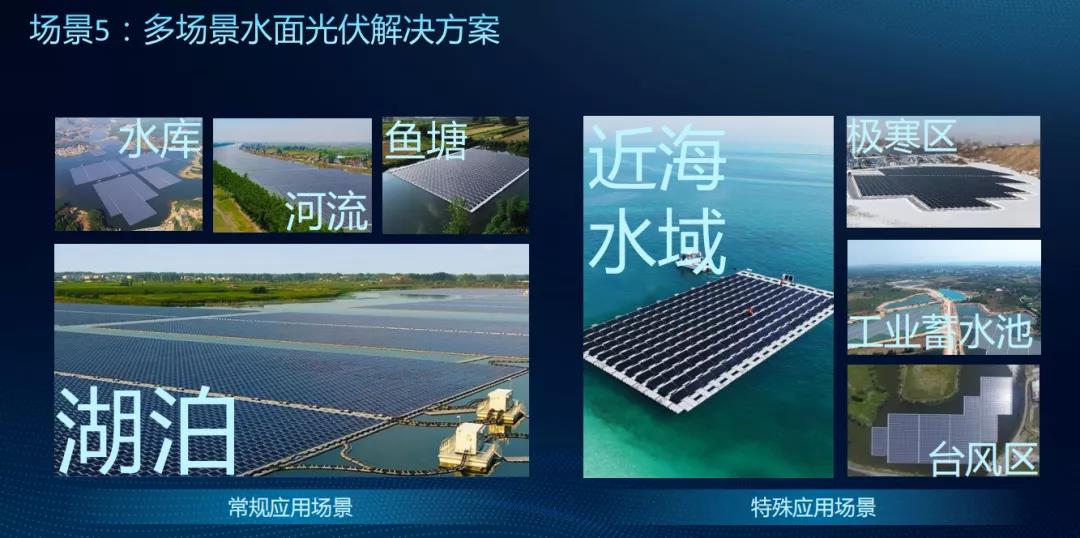 在场景五中,可以看到水面光伏的各种场景应用。一方面是湖泊的应用,这已很广泛了,另一方面也可运用水面光伏,特别是在近海领域,光伏来结合渔业的发展,进一步提高我们水面光伏的收益率。