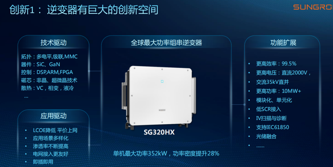 刚刚,阳光电源副总裁李顺已经向大家透露了最新款的全球最大功率组串逆变器SG320HX的特点,它的功率比上一个产品提升了28%。随着散热等等方面的不断创新,我们将来还会推出更大更有优势的逆变器产品,同时看到逆变器现在也需要更多功能的扩展。在应对组串电压方面,也需要考虑怎样更好地做远程调度,这些方面都需要通过逆变器来实现。