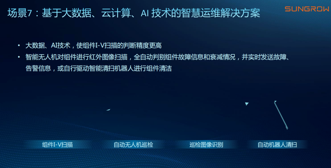 场景七就是我们针对智慧运维的解决方案,大数据、AI技术、使组件1—V扫描的判断精度更高,同时对无人机进行扫描图象识别,也把故障传递出来,甚至通过无人机自动驱动清扫机器人对组件进行清扫。