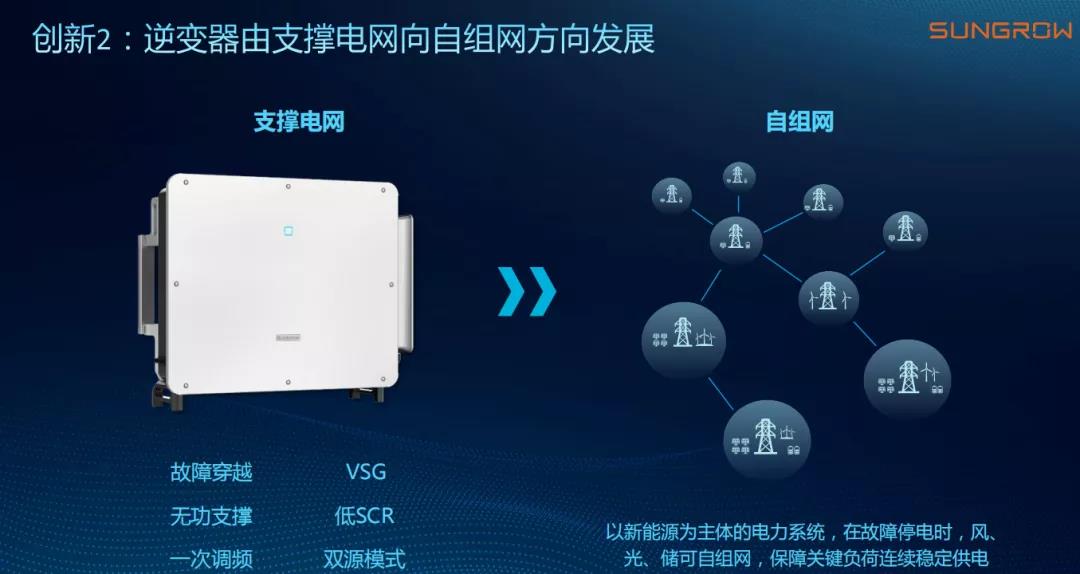 同时我们也看到另外一个非常重要的大趋势,就是我们逆变器已经不仅仅满足于支持电网,还需要向自组网的方向迈进。以新能源为主体的电力系统,在故障停电时,风光储可自组网,保障关键负荷连续稳定供电。