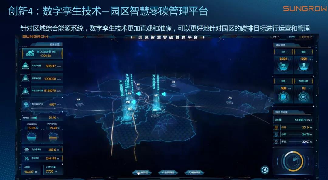 第四个创新在于数字孪生技术的应用。该技术可以非常直观、精准地把我们实际的运行系统进行反应。下图是阳光电源开发的针对于园区的智慧零碳管理平台,可以很好地把光储充(包括用户的设备数据)实时结合起来,针对当前碳排放的指标进行实时分析和管理,并且给出一些管理建议。这会对各类园区、企业甚至城市在实现双创目标上,带来深远的影响。