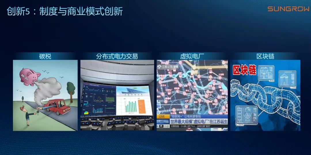 第五大创新就是制度与商业模式上的探索与实践。针对我们的碳税、分布式电力交易方面等都需要有很多制度创新。当然我们也看到了一些可喜成果,虚拟电厂在江苏可以运用,区块链也是在很多城市得到试点。