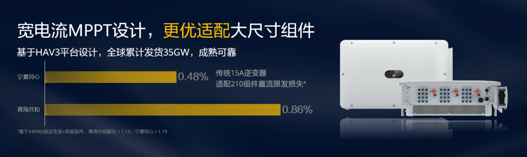 为匹配大尺寸组件高功率、大电流的特性,华为基于HAV3平台全球35 GW的成熟应用,推出更优适配大尺寸组件的宽电流逆变器——SUN2000-196KTL-H3系列,具有宽电流MPPT通道,每路组串输入电流从15A提升至20A,每路MPPT支持电流100A和最多5串输入,可充分发挥大电流组件的优势,最大程度避免直流限发,实现发电量最大化。