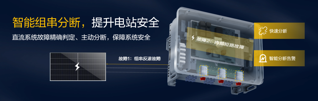随着光伏直流功率的不断提升,直流系统的短路保护问题越发严峻。光伏在发电系统中“担当大任”首先就要保证电站的安全性。此次推出的SUN2000-196KTL-H3系列具备智能组串分断功能:通过高精度直流传感器,精确检测每路组串电流信号,当检测到故障时,能够主动控制直流分断开关,迅速发出脱扣保护和主动告警,实现组串反灌保护与逆变器内部故障保护,有效提升光伏直流系统安全,多维度保障逆变器和电站安全可靠运行。