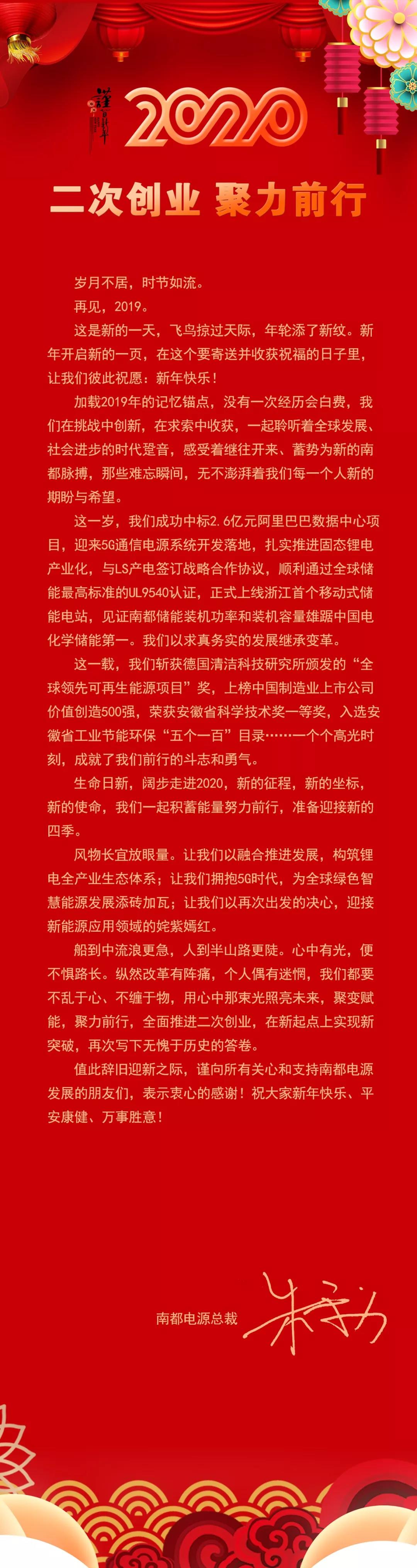 南都电源总裁朱保义2020新年献词 :二次创业 聚力前行
