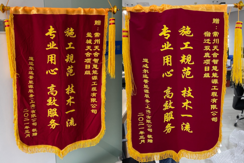 由天合光能股份有限公司全资子公司——常州天合智慧能源工程有限公司,其承建的江苏双鹿电器8MWp屋顶分布式光伏并网发电项目及盐城天合国能科技有限公司6.5MWp屋顶分布式光伏并网发电项目交付后获得高度认可,客户特地送来锦旗,给出了“施工规范 技术一流 专业用心 高效服务”的评价,对天合项目部快速高效完成项目并网工作表示由衷感谢。