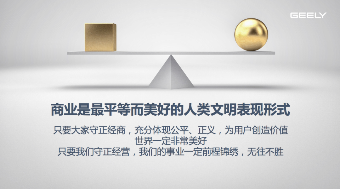 吉利控股集团及其它各业务集团也一样,股权可以增减,资本可以进退,但企业必须做实做强,形成管理层、全体员工共享企业经营成果的主人翁文化,保证企业长期可持续发展。这既是对企业负责,也是对社会负责,更是关系到全体员工的切身利益。要实现以上这些目标,企业治理必须现代化,所有权、经营权就必须分开,这是应对未来挑战的有效法宝。