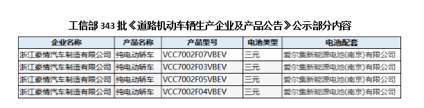 343批公告显示,浙江豪情汽车制造有限公司(下称:豪情汽车)申报的四款纯电动轿车,动力电池来自爱尔集新能源电池(南京)有限公司(下称:爱尔集)。据了解,爱尔集正是LG新能源在华全资子公司。