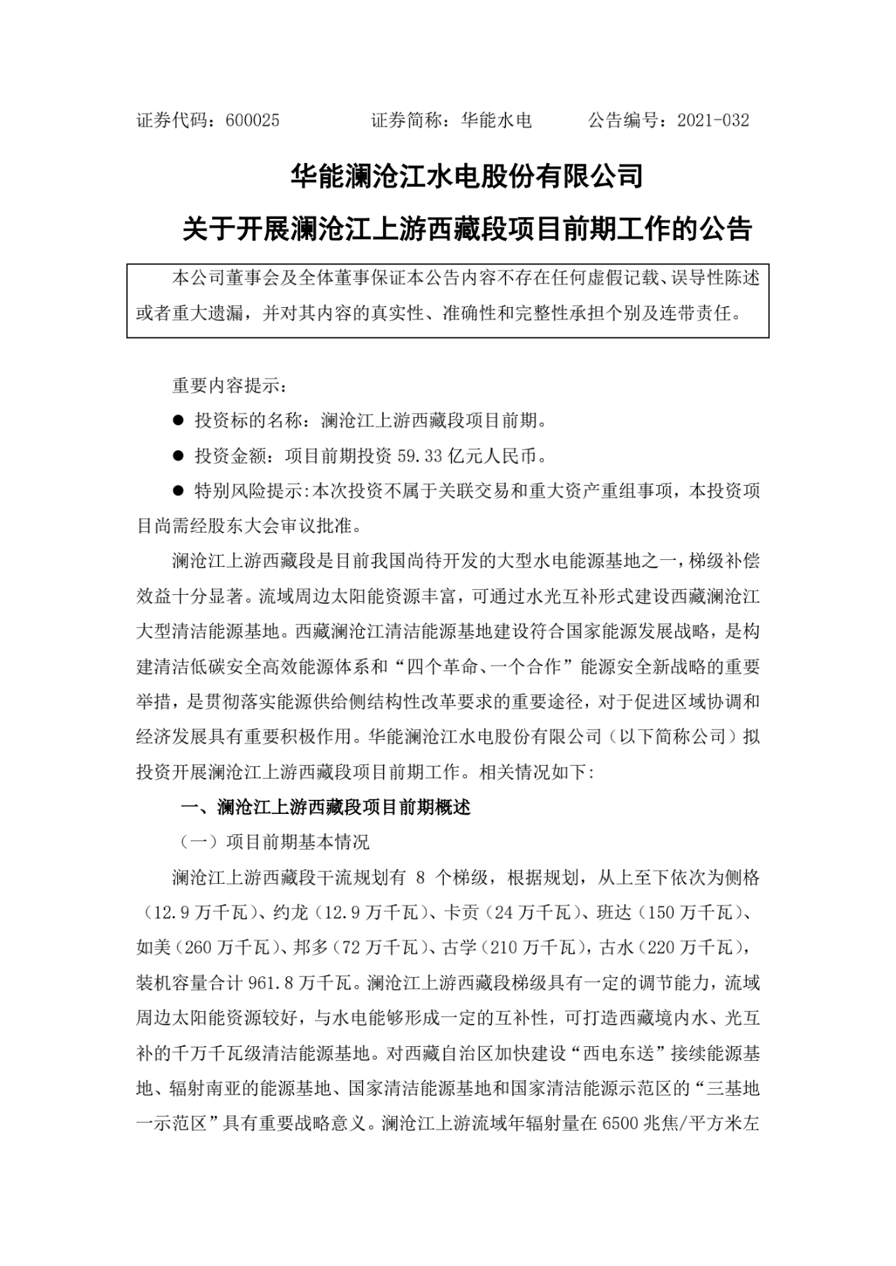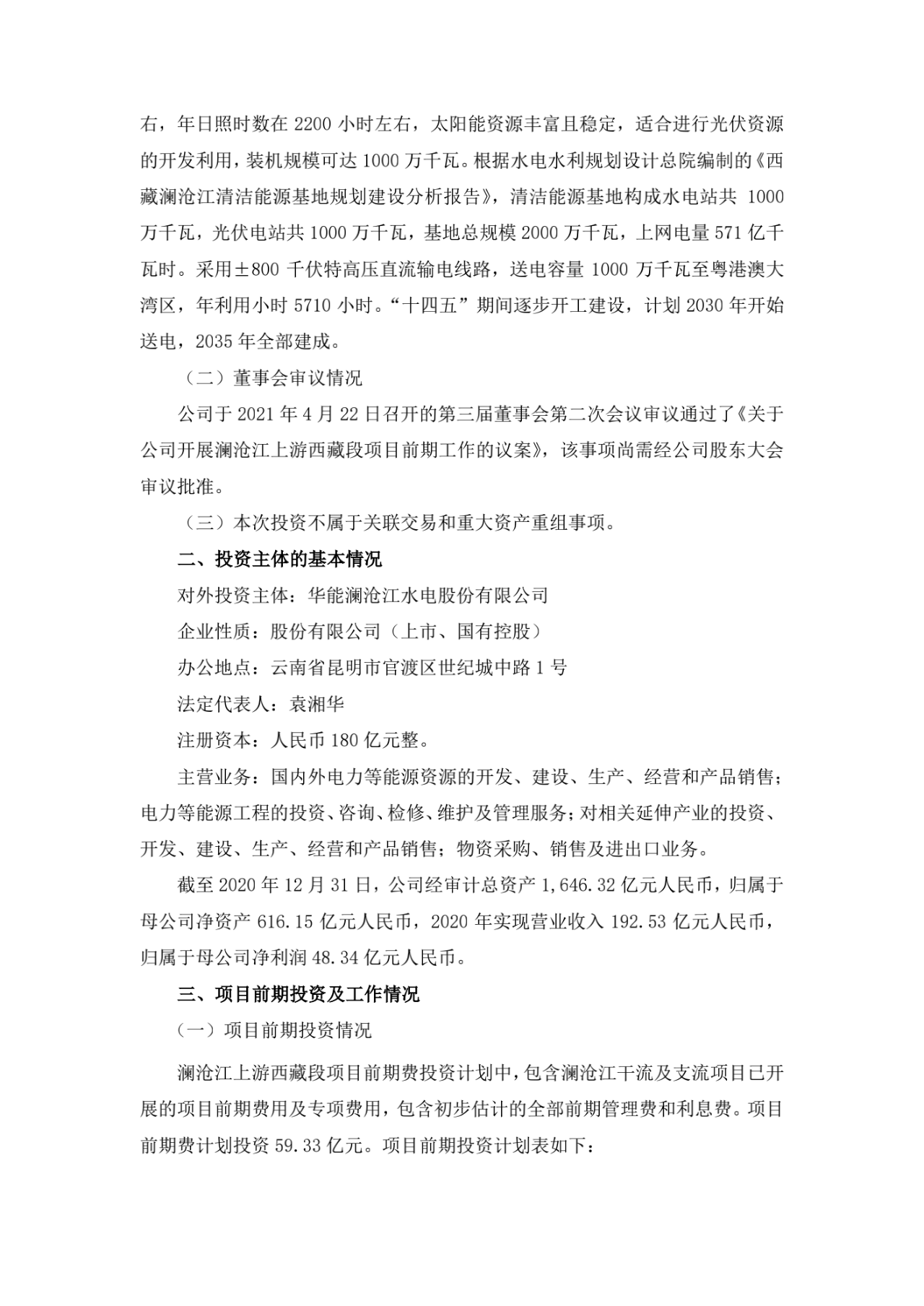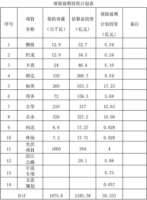 根据公告,澜沧江上游西藏段干流规划有8个梯级,从上至下依次为侧格、约龙、卡贡(24万千瓦)、班达、如美、邦多、古学,古水,装机容量合计961.8万千瓦。澜沧江上游西藏段项目前期工作已经展开,预计投资为59.33亿元,包含初步估计的全部前期管理费和利息费,主要为澜沧江干流及支流项目已开展的项目前期费用及专项费用。光伏方面正在开展澜沧江上游西藏段千万千瓦级清洁能源基地战略定位研究、规划研究、水光互补关键技术研究等工作,前期总投资为4亿元。具体见下表: