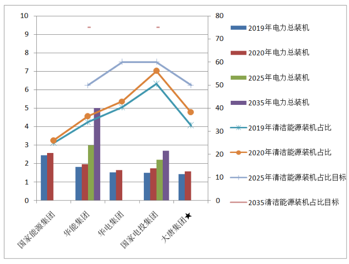 图1 五大发电集团2019、2020、2025、2035年电力总装机及清洁能源装机占比情况或目标