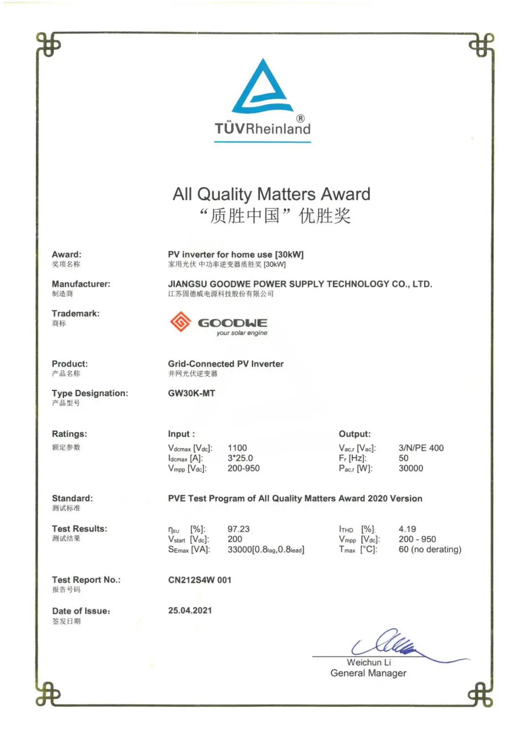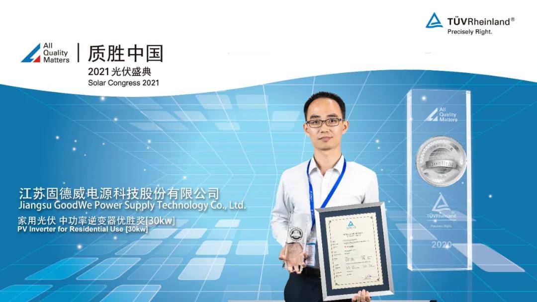 2021年4月28日,德国莱茵TUV质胜中国光伏盛典在杭州举行。固德威连续六年斩获”质胜中国“大奖,在家用光伏大功率光伏逆变器领域斩获行业第一,持续引领分布式光伏市场发展。