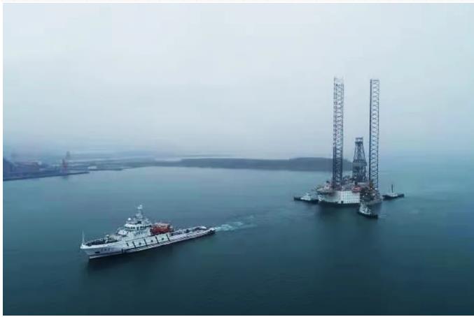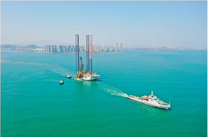 大马力拖轮将“国信”号石油钻探平台缓缓拖离