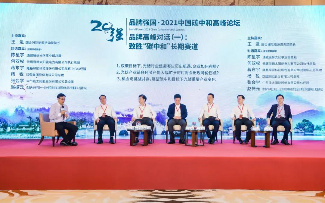 上午还进行了两场品牌高峰对话,由国合洲际能源咨询院院长王进主持,通威股份光伏事业部总裁陈星宇、无锡尚德太阳能电力有限公司总裁何双权、隆基绿能科技股份有限公司战略中心总经理蒋东宇、双登集团股份有限公司总裁杨锐、中节能太阳能股份有限公司总经理张会学、十一科技高级副院长、华北区总裁余才志参加了第一场“致胜“碳中和”长期赛道”品牌高峰对话。