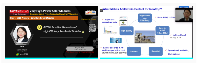 北京时间5月17日晚间,晶硅制造事业部胡丰华女士在德国TaiyangNews超高功率光伏组件在线会议上也面向全球线上首发正泰ASTRO 5s高效户用组件。