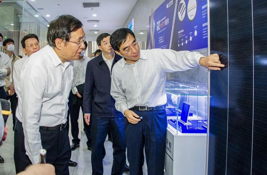沈浩平向张玉卓一行介绍了中环股份在光伏产业的发展成果与未来规划。中环股份作为中国最早从事光伏产业的企业之一,对产业发展方向及自身发展路径有着清晰的认知。公司通过G12光伏硅片、高效叠瓦组件两大技术平台,结合工业4.0生产制造模式,以客户为中心,市场为导向,持续引领光伏产业降本增效。