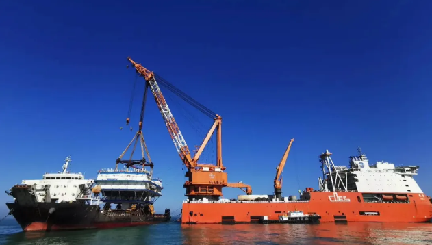 完成国内首座斜桩植入嵌岩导管架基础海上升压站吊装