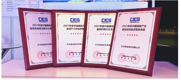 同期举办的2021“储能之夜”暨中国储能产业最具影响力系列奖项颁奖典礼上,科华荣获“2021年度中国储能产业最具影响力企业奖”、“2021年度中国储能产业最佳综合能源服务商奖”、“2021年度中国储能产业最佳系统集成解决方案企业奖”、“2021年度中国储能产业最佳PCS供应商奖”等奖项。