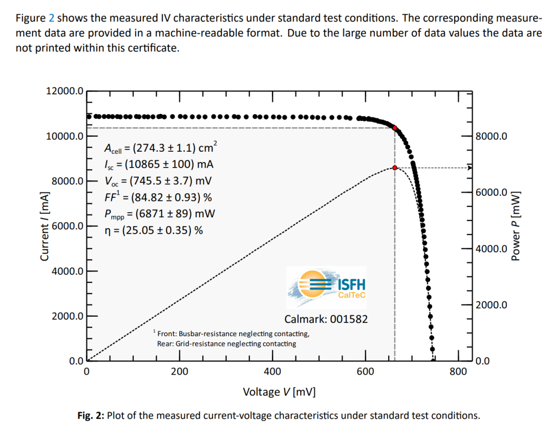 近日,经德国哈梅林太阳能研究所(ISFH)测试认证,迈为股份研制的异质结太阳能电池片,其全面积(大尺寸M6,274.3cm2)光电转换效率达到了25.05%,刷新了异质结量产技术领域的最高纪录。