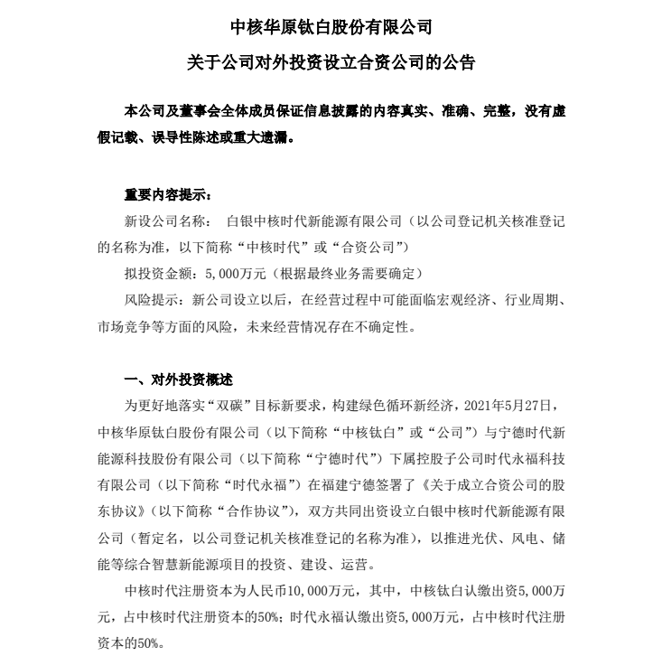 5月28日,中核华原钛白股份有限公司(以下简称“中核钛白”)发布关于公司对外投资设立合资公司的公告。