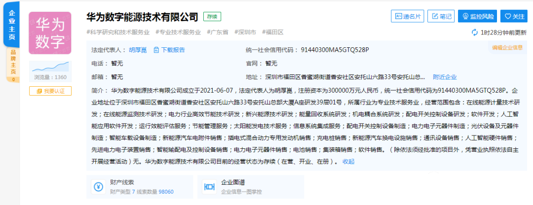 6月7日,华为数字能源技术有限公司成立。据公开信息显示:华为数字能源公司法定代表人为胡厚崑,注册资本30亿人民币,经营范围包括在线能源计量技术研发;新兴能源技术研发;能量回收系统研发;机电耦合系统研发;新能源汽车换电设施销售等。股东信息显示,该公司由华为技术有限公司全资持股。