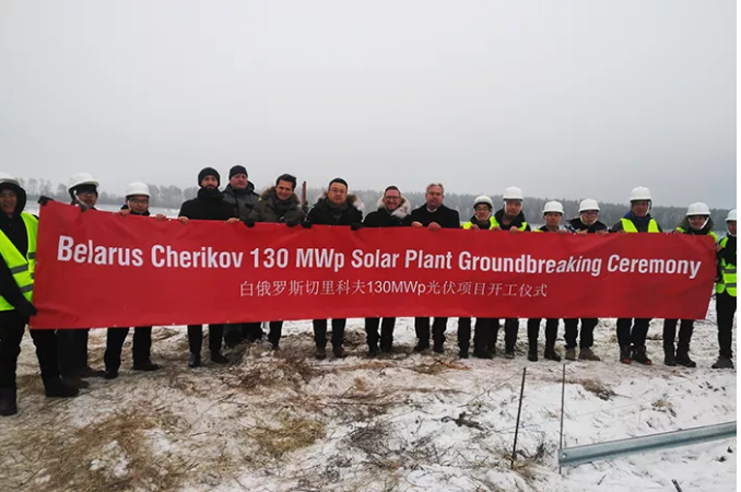 公司党委书记、董事长郭玮冒着零下10几度的低温,来到白俄罗斯切里科夫(Cherikov)130兆瓦光伏项目现场视察,并与当地业主方共同举行项目开工仪式和新闻发布会。伴随着打桩机的轰鸣声,在鹅毛般的飞雪中光伏支架被一寸一寸的打入雪地下,白俄罗斯切里科夫 130兆瓦光伏发电项目正式开工建设。