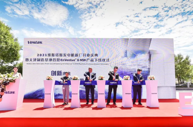 2021年6月18日,维斯塔斯发电机新厂在天津泰达经济技术开发区落成开业,此举标志着维斯塔斯在华制造布局正式迈入6MW时代。该发电机厂投资额约2亿元人民币,占地面积超过15万平方米,生产车间占地面积近9千平方米,主要用于为维斯塔斯全球领先的6MW EnVentus™风机平台生产发电机部件。新的发电机厂的设计产能为每年1500台,2021年产值预计达到8亿人民币,并在未来直接创造120多个就业机会。