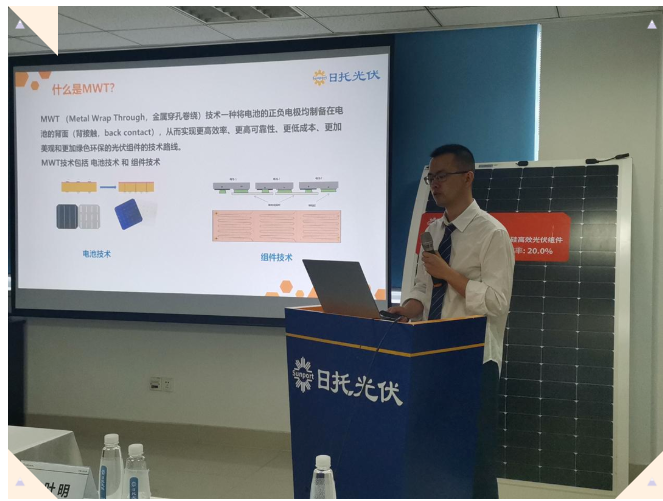 针对建筑光伏产品应用,推介会现场,日托光伏新产品部总监王祺博士带来了高效背接触MWT轻质组件及应用解读。王祺博士详细介绍了MWT技术的原理及生产工艺,首次公开了精细的打孔导电技术及拥有独家专利的导电芯背板及GPS绝缘层产品设计,其作日托光伏的技术核心,也是实现MWT产品成熟量产的关键。MWT (Metal Wrap Through,金属穿孔卷绕)技术是一种将电池的正负电极均制备在电池的背面(背接触,back contact),从而实现更高效率、更高可靠性、更低成本、更加美观和更加绿色环保的光伏组件的技术路线。其相较于常规组件,正面无主栅线无焊带设计,正面遮光面积减少3%,单晶硅电池效率达到23%以上。关于S系轻质柔性组件,王祺博士介绍到,其基于MWT技术采用独有PCB组件封装技术,以特殊柔性有机材料结合MWT电池、导电芯背板,使产品在MWT技术高效率、高可靠性优势基础上,同时具备轻质、超薄及高柔韧性等特点,每平方米重量仅为2.5kg,方便搬运,降低组件安装成本;同时,组件采用无边框设计,无需接地,具有低BOS优势;组件外形更美观,其基于MWT技术独特外形设计且低反光,无炫光,提高组件发电功率。S系组件包括S-FLEX 6、S-FLEX 1、S-FLEX6Ⅱ以及彩钢瓦一体化产品,满足用户多样化需求,目前已成功应用于海内外多类型项目。