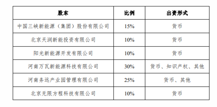金风科技全资子公司北京天润新能投资有限公司、与三峡新能源、阳光新能源开发有限公司、河南万瓦新能源科技有限公司、河南务远产业园管理有限公司、北京无限方程科技有限公司共同签署协议,在河南省新乡市合资成立新公司“河南新电能源投资发展有限公司”,注册资金5亿元。合资公司股权如下: